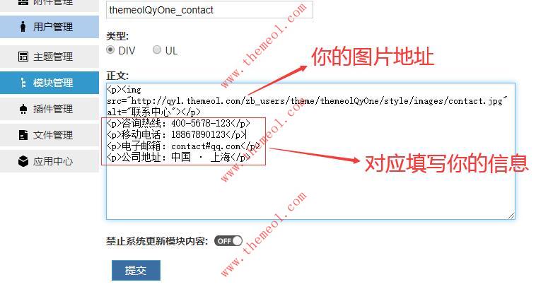 首先,大家點(diǎn)擊zblog原生后臺(tái)左側(cè)導(dǎo)航處的“模塊管理”按鈕,進(jìn)入后,找到“聯(lián)系我們”模塊,點(diǎn)擊此模塊上的編輯圖標(biāo)按鈕進(jìn)入具體編輯頁(yè),選擇DIV模式,最后寫入下方代碼即可: