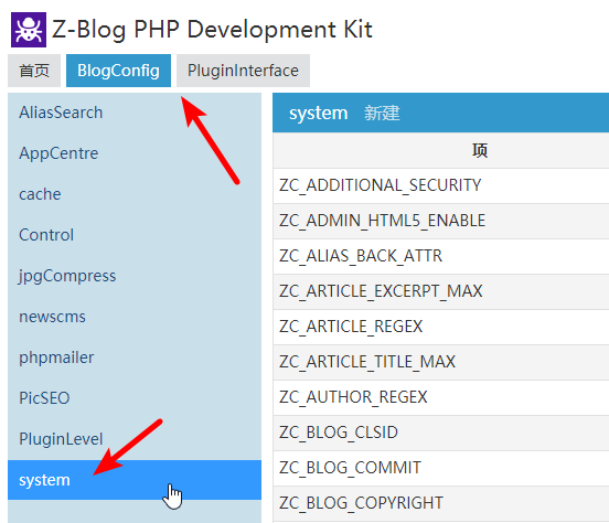 2、點擊BlogConfig按鈕,進(jìn)入應(yīng)用選項頁面,并點擊system按鈕。