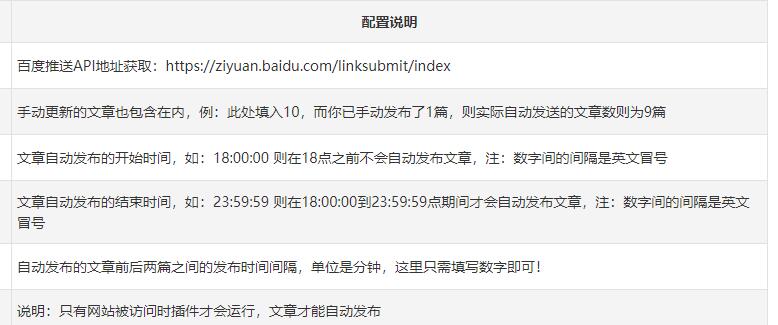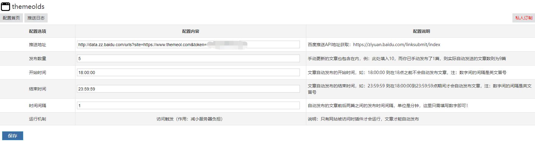 本款插件:站長只需在后臺(tái)配置里設(shè)定一個(gè)插件運(yùn)行的時(shí)間點(diǎn)和每日發(fā)布的文章數(shù)即可!當(dāng)時(shí)間一到,插件就會(huì)自動(dòng)運(yùn)行,省時(shí)省力!再也不用為每篇文章設(shè)置個(gè)發(fā)布時(shí)間了!并且為了更加符合SEO優(yōu)化的要求,我們還可以設(shè)置一個(gè)自動(dòng)發(fā)布文章的時(shí)間間隔,即:每隔多長時(shí)間發(fā)布一篇文章,很智能!