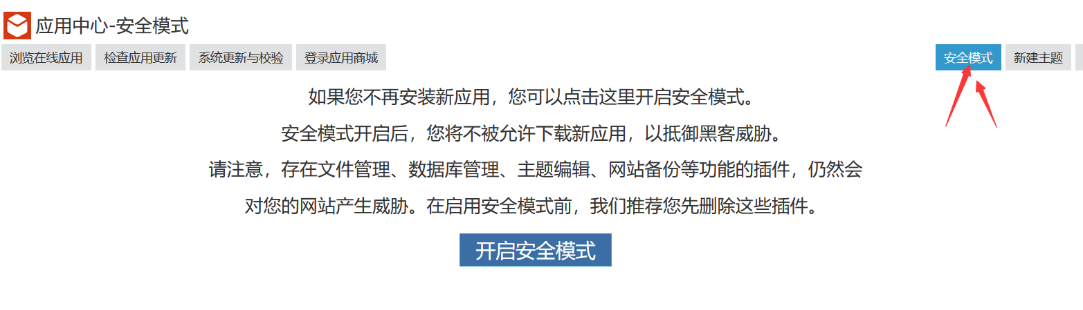 ②后臺(tái)->應(yīng)用中心->安全模式,如下圖: