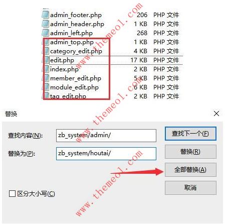 然后進(jìn)入管理目錄houtai,用記事本打開(kāi)其中的源文件admin_top.php、category_edit.php、edit.php、index.php、member_edit.php、module_edit.php、tag_edit.php。在這些文件中使用替換功能將zb_system/admin/替換為zb_system/houtai/。