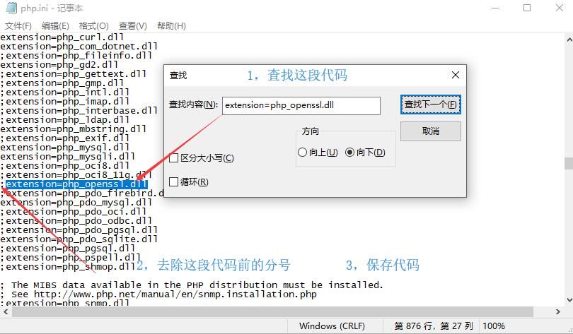 2,通過搜索找到代碼extension=php_openssl.dll,去除這段代碼前的分號(hào)“;”。
